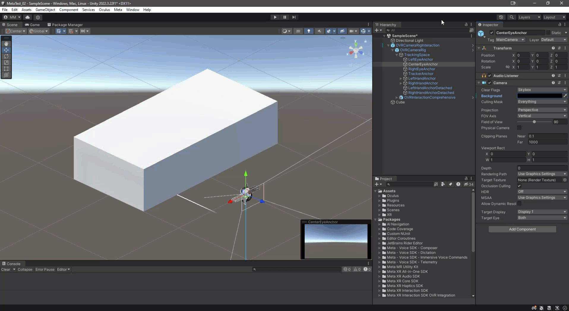 * Select the 'CenterEyeAnchor' asset under 'CameraOVRRig / TrackingSpace'.