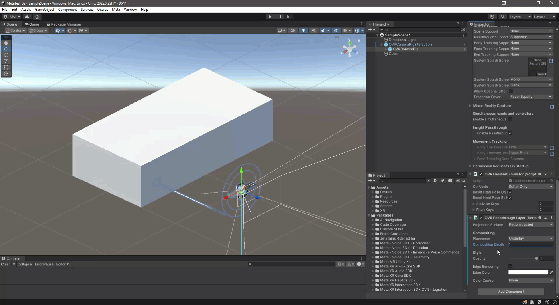 For mixed reality to work we need to be able to see the environment around the headset. For passthrough to work we need to add a couple more elements within the project.&#x20;